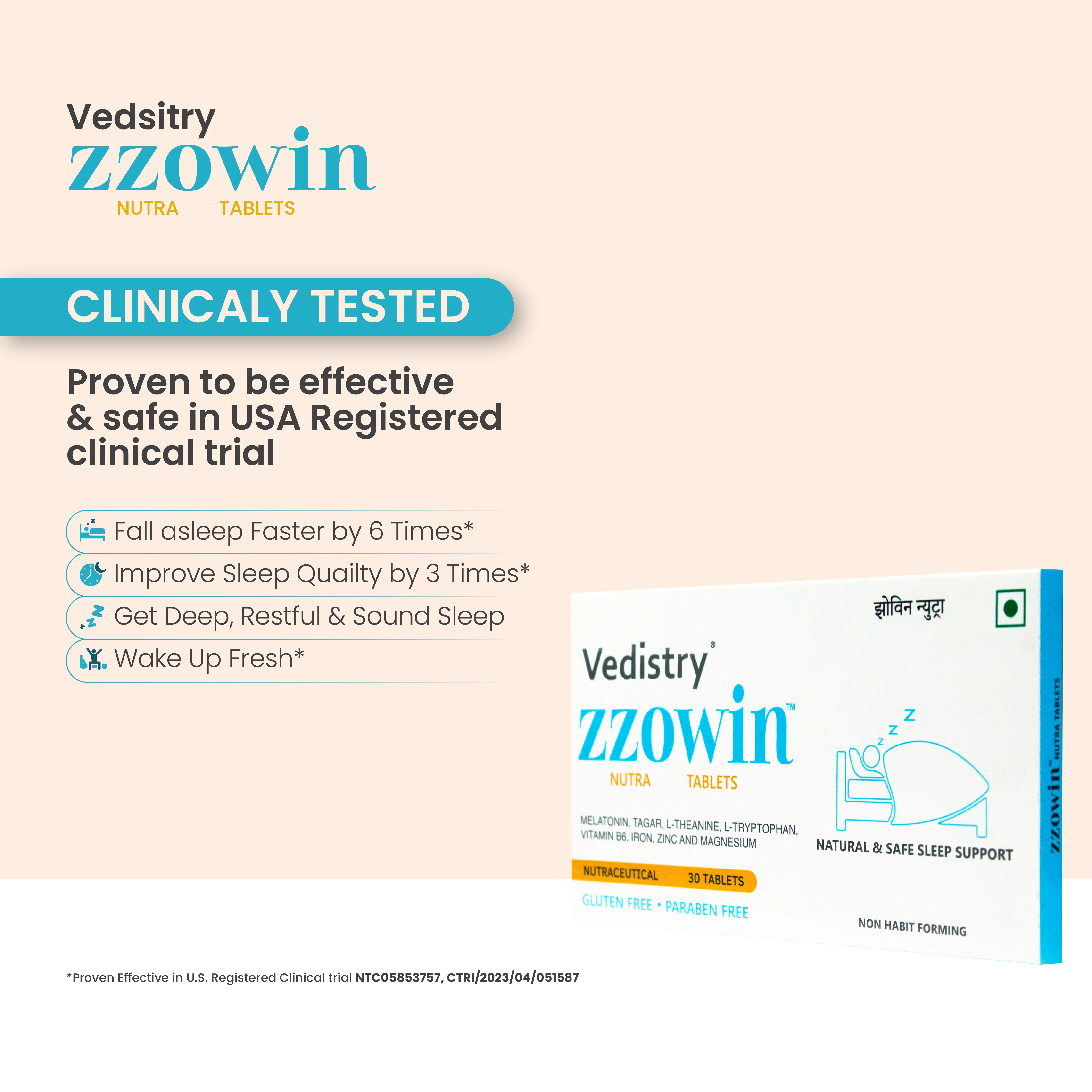 - Clinically Tested in USA Registered Trials : Zzowin is a clinically tested natural sleep supplement designed to improve sleep quality, manage insomnia, and promote longer, more restful sleep. With Melatonin 5mg, Tagar, Magnesium this formula is proven in U.S. Registered Clinical Trials (NTC05853757, CTRI/2023/04/051587) to help users fall asleep 6 times faster, improve sleep quality 3 times, and wake up refreshed.